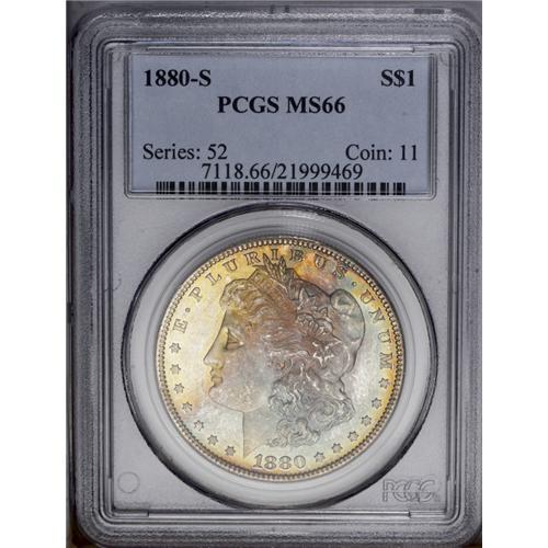 <B>1880-S<img border='0' src='http://www.heritagecoins.com/images/star.gif' width=10 height=10>$1> MS66 PCGS.</B></I> Coruscating luster is overlain with a melange of iridescent orange-gold, mauve, lavender, and aquamarine toning on the obverse, while the reverse exhibits whispers of peripheral cobalt-blue, golden-brown and lavender patina. the design elements are well brought up throughout. A few minute marks on the cheek and eyebrow are mentioned for accuracy. <BR><BR><B>Important notice:</B> Heritage usually auctions material at the rate of 200-250 lots per hour. On some occasions eBay Live bid software or the Internet may not be able to keep up with the pace of the auction. We recommend placing a realistic absentee bid now as insurance to avoid disappointment. Occasionally the auctioneer may eliminate or reject an eBay Live bid, and the auctioneer may also reopen a lot after the close of the eBay live bidding (usually because we missed an audience bid), and may reject your bid even if it shows you as the winning bidder. By bidding via eBay Live, you agree that Heritage may award the lot to another bidder at its sole discretion under the circumstances described above or any other reasonable circumstances. Since eBay bids are not shown to us until we open the lot on the floor, we treat those bids just like floor bids. In most cases the floor responds before the eBay bid is presented to us, due to Internet lag time, so for consistency we have made it a policy that floor bids are always considered first over tie eBay live bids. Also please note that all Heritage lots purchased through eBay Live carry a 20% Buyer's Premium. Please make sure you read the Terms and Conditions before you bid. This lot is being auctioned in conjunction with a live floor auction by Heritage Galleries & Auctioneers. All final auction and invoice information will be supplied by Heritage Galleries & Auctioneers, and all other information should be considered preliminary. Lot:3290 <BR><BR><B>Winning Notification and Billing:</B> After the FINAL session in this auction is complete, Heritage will send e-mail and snail mail invoices. This process normally takes several days. All final auction and invoice information will be supplied by Heritage Galleries & Auctioneers, and all other information should be considered preliminary. <BR><BR>This auction will be conducted on a live auction floor and over the Internet through eBay Live. If you choose to place an absentee bid, please take a moment to <font color='#0000ff'><u><a href='http://pages.ebay.com/liveauctions/help/before/laabsentee.html'>learn how eBay Live absentee bidding works</a></u></font><font color='#000000'>