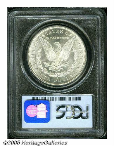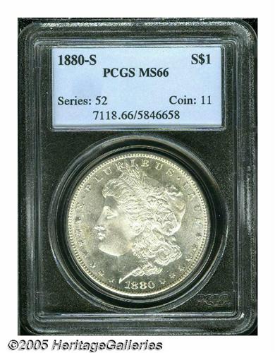 <B>1880-S<S$1> MS66 PCGS.</B></I> Frosty silver-gray surfaces display a few light touches of gold on the obverse, and appear to be devoid of mentionable marks. The design elements are sharply impressed, though the hair over Liberty's ear shows some minor softness.