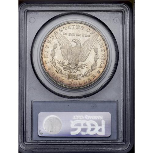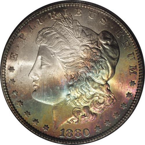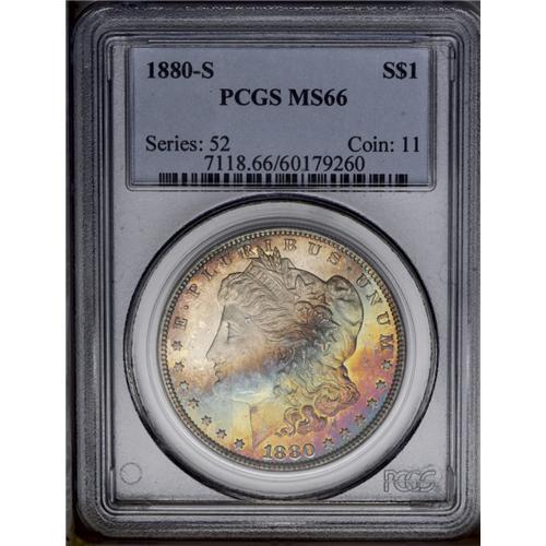 <B>1880-S<img border='0' src='http://www.heritagecoins.com/images/star.gif' width=10 height=10>$1> MS66 PCGS.</B></I> Phenomenal iridescent rainbow toning covers the lower half of the obverse in bands of jade-green, yellow, and fuchsia. Careful scrutiny with a glass reveals few abrasions, aside from a couple of scrapes on the chin and neck. Boldly struck as well, and incredibly appealing. A color lover's dream. <BR><BR><B>Important notice:</B> Heritage usually auctions material at the rate of 200-250 lots per hour. On some occasions eBay Live bid software or the Internet may not be able to keep up with the pace of the auction. We recommend placing a realistic absentee bid now as insurance to avoid disappointment. Occasionally the auctioneer may eliminate or reject an eBay Live bid, and the auctioneer may also reopen a lot after the close of the eBay live bidding (usually because we missed an audience bid), and may reject your bid even if it shows you as the winning bidder. By bidding via eBay Live, you agree that Heritage may award the lot to another bidder at its sole discretion under the circumstances described above or any other reasonable circumstances. Since eBay bids are not shown to us until we open the lot on the floor, we treat those bids just like floor bids. In most cases the floor responds before the eBay bid is presented to us, due to Internet lag time, so for consistency we have made it a policy that floor bids are always considered first over tie eBay live bids. Also please note that all Heritage lots purchased through eBay Live carry a 20% Buyer's Premium. Please make sure you read the Terms and Conditions before you bid. This lot is being auctioned in conjunction with a live floor auction by Heritage Galleries & Auctioneers. All final auction and invoice information will be supplied by Heritage Galleries & Auctioneers, and all other information should be considered preliminary. Lot:3286 <BR><BR><B>Winning Notification and Billing:</B> After the FINAL session in this auction is complete, Heritage will send e-mail and snail mail invoices. This process normally takes several days. All final auction and invoice information will be supplied by Heritage Galleries & Auctioneers, and all other information should be considered preliminary. <BR><BR>This auction will be conducted on a live auction floor and over the Internet through eBay Live. If you choose to place an absentee bid, please take a moment to <font color='#0000ff'><u><a href='http://pages.ebay.com/liveauctions/help/before/laabsentee.html'>learn how eBay Live absentee bidding works</a></u></font><font color='#000000'>