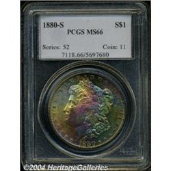 <B>1880-S<S$1> MS66 PCGS.</B></I> Gem surfaces are covered in emerald-green, magenta, and reddish-gold colors. Nicely struck with considerable eye-appeal and interesting toning that must be seen to be appreciated.<BR><I>From the JFS Collection.</B></I> <BR><BR><B>Important notice:</B> Heritage usually auctions material at the rate of 200-250 lots per hour. On some occasions eBay Live bid software or the Internet may not be able to keep up with the pace of the auction. We recommend placing a realistic absentee bid now as insurance to avoid disappointment. Occasionally the auctioneer may eliminate or reject an eBay Live bid, and the auctioneer may also reopen a lot after the close of the eBay live bidding (usually because we missed an audience bid), and may reject your bid even if it shows you as the winning bidder. By bidding via eBay Live, you agree that Heritage may award the lot to another bidder at its sole discretion under the circumstances described above or any other reasonable circumstances. Since eBay bids are not shown to us until we open the lot on the floor, we treat those bids just like floor bids. In most cases the floor responds before the eBay bid is presented to us, due to Internet lag time, so for consistency we have made it a policy that floor bids are always considered first over tie eBay live bids. Also please note that all Heritage lots purchased through eBay Live carry a 20% Buyer's Premium. Please make sure you read the Terms and Conditions before you bid. </span></font></tr></table></td></tr></table>