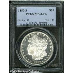 1880-S S$1 MS66 Prooflike PCGS. Medium S. A meticu <B>1880-S S$1 MS66 Prooflike PCGS.</B></I> Medium S. A meticulously struck premium Gem with frosty devices and strongly mirrored fields. An impressive and attractively preserved representative of this available Silver Dollar issue. <BR><BR><B>Important notice:</B> Heritage usually auctions material at the rate of 200-250 lots per hour. On some occasions eBay Live bid software or the Internet may not be able to keep up with the pace of the auction. We recommend placing a realistic absentee bid now as insurance to avoid disappointment. Occasionally the auctioneer may eliminate or reject an eBay Live bid, and the auctioneer may also reopen a lot after the close of the eBay live bidding (usually because we missed an audience bid), and may reject your bid even if it shows you as the winning bidder. By bidding via eBay Live, you agree that Heritage may award the lot to another bidder at its sole discretion under the circumstances described above or any other reasonable circumstances. Since eBay bids are not shown to us until we open the lot on the floor, we treat those bids just like floor bids. In most cases the floor responds before the eBay bid is presented to us, due to Internet lag time, so for consistency we have made it a policy that floor bids are always considered first over tie eBay live bids. Also please note that all Heritage lots purchased through eBay Live carry a 20% Buyer's Premium. Please make sure you read the Terms and Conditions before you bid. This lot is being auctioned in conjunction with a live floor auction by Heritage Galleries & Auctioneers. All final auction and invoice information will be supplied by Heritage Galleries & Auctioneers, and all other information should be considered preliminary. Lot:7368