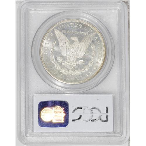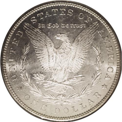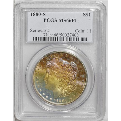 <B>1880-S<img border='0' src='http://www.heritagecoins.com/images/star.gif' width=10 height=10>$1> MS66 Prooflike PCGS.</B></I> Medium S. The obverse is regally toned in swaths of lemon, rose, and powder-blue patina. The reverse, in contrast, is only faintly toned in cream-gray and gold hues. The strike is precise, and only unimportant contact is detected.