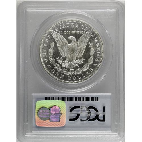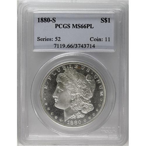 <B>1880-S<img border='0' src='http://www.heritagecoins.com/images/star.gif' width=10 height=10>$1> MS66 Prooflike PCGS.</B></I> The great luster and sharp strike that are hallmarks of this issue are on full display on this mostly brilliant and minimally abraded coin. A spot has toned darkly between the B and U of PLURIBUS.<BR><I>From The Chicago-Ark Collection.</B></I>