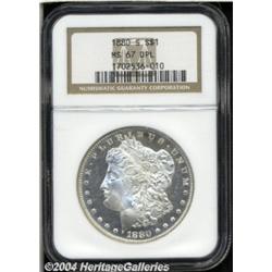 <B>1880-S<S$1> MS67 Deep Mirror Prooflike NGC.</B></I> This is an exquisite and Superb Gem with amazing aesthetic appeal. The surfaces on each side are absolutely brilliant without any evidence of toning. With deeply mirrored fields and lustrous devices, this lovely dollar has exceptional contrast. This is the Large Mintmark variety with the upper interior space filled. Population: 12 in 67, 1 finer (7/04). <BR><BR><B>Important notice:</B> Heritage usually auctions material at the rate of 200-250 lots per hour. On some occasions eBay Live bid software or the Internet may not be able to keep up with the pace of the auction. We recommend placing a realistic absentee bid now as insurance to avoid disappointment. Occasionally the auctioneer may eliminate or reject an eBay Live bid, and the auctioneer may also reopen a lot after the close of the eBay live bidding (usually because we missed an audience bid), and may reject your bid even if it shows you as the winning bidder. By bidding via eBay Live, you agree that Heritage may award the lot to another bidder at its sole discretion under the circumstances described above or any other reasonable circumstances. Since eBay bids are not shown to us until we open the lot on the floor, we treat those bids just like floor bids. In most cases the floor responds before the eBay bid is presented to us, due to Internet lag time, so for consistency we have made it a policy that floor bids are always considered first over tie eBay live bids. Also please note that all Heritage lots purchased through eBay Live carry a 20% Buyer's Premium. Please make sure you read the Terms and Conditions before you bid. </span></font></tr></table></td></tr></table>