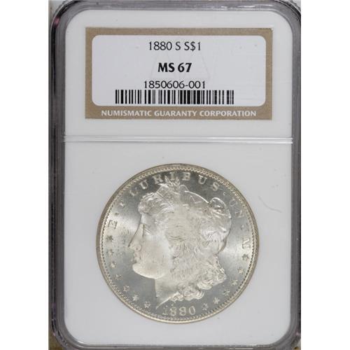 <B>1880-S S$1 MS67 NGC.</B></I> Large S. A nearly brilliant Superb Gem that has a semi-prooflike obverse and blazing cartwheel luster across the reverse. Splendidly preserved with incredible eye appeal. Nearly twice as many Medium S varieties are known as Large S varieties.<BR><BR><b>Shipping:</b> Coins & Currency (<a target="_blank" href="http://www.heritageauctions.com/common/shipping.php">view shipping information</a>)