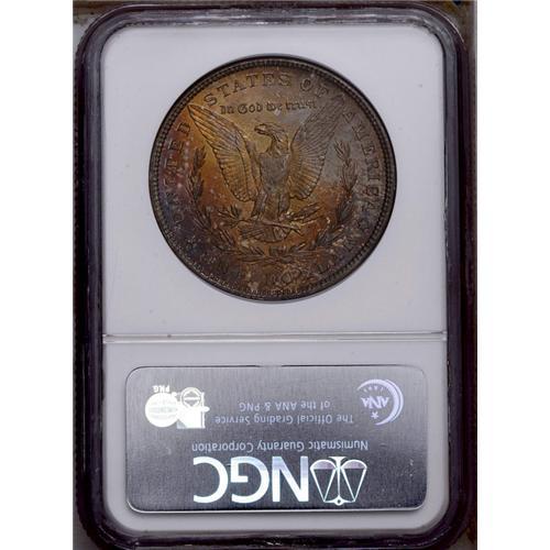 <B>1880-S<img border='0' src='http://www.heritagecoins.com/images/star.gif' width=10 height=10>$1> MS67 NGC.</B></I> Large S. Beautiful orange, ruby-red, blue-green, and cream patination endows the reverse. The obverse is brilliant, except for a thin band of gold along the lower border. A well struck, highly lustrous, and gorgeously preserved Superb Gem. Encased in a prior generation holder.