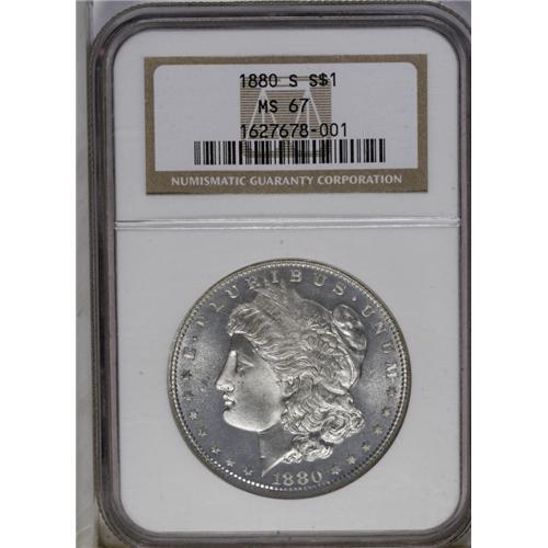 <B>1880-S<img border='0' src='http://www.heritagecoins.com/images/star.gif' width=10 height=10>$1> MS67 NGC.</B></I> Large S mintmark. Icy portraits provide mild contrast with the lustrous semi-prooflike fields. This intricately struck and brilliant silver dollar has clean surfaces and impressive eye appeal.