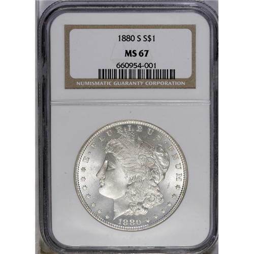 <B>1880-S<img border='0' src='http://www.heritagecoins.com/images/star.gif' width=10 height=10>$1> MS67 NGC.</B></I> Medium S. A whisper of chestnut toning visits this semi-prooflike and crisply impressed Superb Gem. Outstanding quality despite a nearly imperceptible fingerprint fragment beneath STATES.