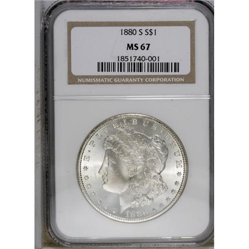 1880-S S$1 MS67 NGC. Medium S. An assertively struck S