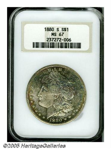 <B>1880-S<S$1> MS67 NGC.</B></I> Medium S. Lustrous surfaces are dominated by cobalt-blue and purple on the obverse, and by russet and reddish-gold on the reverse. Nicely struck, with no significant contact marks noted.