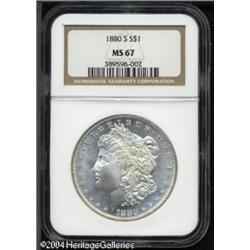 1880-S S$1 MS67 NGC. Medium S. Potent luster and a <B>1880-S S$1 MS67 NGC.</B></I> Medium S. Potent luster and a virtually pristine obverse confirm the high quality of this faintly toned Superb Gem. A common date, but with uncommon eye appeal. <BR><BR><B>Important notice:</B> Heritage usually auctions material at the rate of 200-250 lots per hour. On some occasions eBay Live bid software or the Internet may not be able to keep up with the pace of the auction. We recommend placing a realistic absentee bid now as insurance to avoid disappointment. Occasionally the auctioneer may eliminate or reject an eBay Live bid, and the auctioneer may also reopen a lot after the close of the eBay live bidding (usually because we missed an audience bid), and may reject your bid even if it shows you as the winning bidder. By bidding via eBay Live, you agree that Heritage may award the lot to another bidder at its sole discretion under the circumstances described above or any other reasonable circumstances. Since eBay bids are not shown to us until we open the lot on the floor, we treat those bids just like floor bids. In most cases the floor responds before the eBay bid is presented to us, due to Internet lag time, so for consistency we have made it a policy that floor bids are always considered first over tie eBay live bids. Also please note that all Heritage lots purchased through eBay Live carry a 20% Buyer's Premium. Please make sure you read the Terms and Conditions before you bid. This lot is being auctioned in conjunction with a live floor auction by Heritage Galleries & Auctioneers. All final auction and invoice information will be supplied by Heritage Galleries & Auctioneers, and all other information should be considered preliminary. Lot:7364