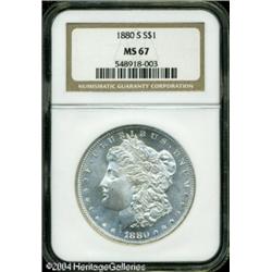1880-S S$1 MS67 NGC. Sharply struck, save for a to <B>1880-S S$1 MS67 NGC.</B></I> Sharply struck, save for a touch of softness in the hair above Liberty's ear. Lustrous surfaces are virtually white. The fields are somewhat prooflike. <BR><BR><B>Important notice:</B> Heritage usually auctions material at the rate of 200-250 lots per hour. On some occasions eBay Live bid software or the Internet may not be able to keep up with the pace of the auction. We recommend placing a realistic absentee bid now as insurance to avoid disappointment. Occasionally the auctioneer may eliminate or reject an eBay Live bid, and the auctioneer may also reopen a lot after the close of the eBay live bidding (usually because we missed an audience bid), and may reject your bid even if it shows you as the winning bidder. By bidding via eBay Live, you agree that Heritage may award the lot to another bidder at its sole discretion under the circumstances described above or any other reasonable circumstances. Since eBay bids are not shown to us until we open the lot on the floor, we treat those bids just like floor bids. In most cases the floor responds before the eBay bid is presented to us, due to Internet lag time, so for consistency we have made it a policy that floor bids are always considered first over tie eBay live bids. Also please note that all Heritage lots purchased through eBay Live carry a 20% Buyer's Premium. Please make sure you read the Terms and Conditions before you bid. This lot is being auctioned in conjunction with a live floor auction by Heritage Galleries & Auctioneers. All final auction and invoice information will be supplied by Heritage Galleries & Auctioneers, and all other information should be considered preliminary. Lot:7365