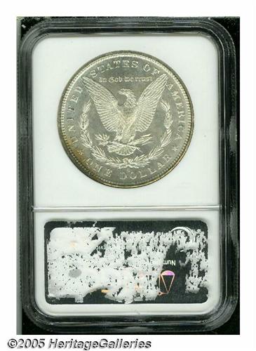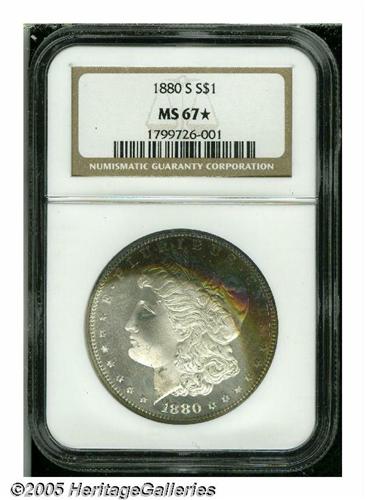 <B>1880-S<S$1> MS67 NGC.</B></I> Well struck with blazing luster over the mostly white surfaces, that also display a wide arc of vivid emerald-green, purple-red, and gold toning on the upper obverse. A couple of very small marks, on the lower obverse, do little to impair the eye appeal of this flashy, expertly preserved Superb Gem.