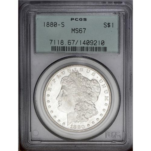 <B>1880-S<img border='0' src='http://www.heritagecoins.com/images/star.gif' width=10 height=10>$1> MS67 PCGS.</B></I> Intense luster is exuded from silver-gray surfaces that display a wave of yellow toning along the upper reverse border. The design elements are well impressed, and just a few miniscule marks occur on the cheek. <BR><BR><B>Important notice:</B> Heritage usually auctions material at the rate of 200-250 lots per hour. On some occasions eBay Live bid software or the Internet may not be able to keep up with the pace of the auction. We recommend placing a realistic absentee bid now as insurance to avoid disappointment. Occasionally the auctioneer may eliminate or reject an eBay Live bid, and the auctioneer may also reopen a lot after the close of the eBay live bidding (usually because we missed an audience bid), and may reject your bid even if it shows you as the winning bidder. By bidding via eBay Live, you agree that Heritage may award the lot to another bidder at its sole discretion under the circumstances described above or any other reasonable circumstances. Since eBay bids are not shown to us until we open the lot on the floor, we treat those bids just like floor bids. In most cases the floor responds before the eBay bid is presented to us, due to Internet lag time, so for consistency we have made it a policy that floor bids are always considered first over tie eBay live bids. Also please note that all Heritage lots purchased through eBay Live carry a 20% Buyer's Premium. Please make sure you read the Terms and Conditions before you bid. This lot is being auctioned in conjunction with a live floor auction by Heritage Galleries & Auctioneers. All final auction and invoice information will be supplied by Heritage Galleries & Auctioneers, and all other information should be considered preliminary. Lot:3291 <BR><BR><B>Winning Notification and Billing:</B> After the FINAL session in this auction is complete, Heritage will send e-mail and snail mail invoices. This process normally takes several days. All final auction and invoice information will be supplied by Heritage Galleries & Auctioneers, and all other information should be considered preliminary. <BR><BR>This auction will be conducted on a live auction floor and over the Internet through eBay Live. If you choose to place an absentee bid, please take a moment to <font color='#0000ff'><u><a href='http://pages.ebay.com/liveauctions/help/before/laabsentee.html'>learn how eBay Live absentee bidding works</a></u></font><font color='#000000'>
