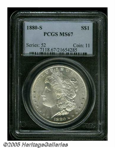 <B>1880-S<S$1> MS67 PCGS.</B></I> Large S. Lightly toned, although a few tiny freckles of tan toning accompany the right reverse border. A meticulously struck and mildly prooflike Superb Gem that has uncommonly clean fields.