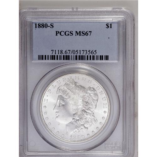 <B>1880-S<img border='0' src='http://www.heritagecoins.com/images/star.gif' width=10 height=10>$1> MS67 PCGS.</B></I> Large S. This magnificent Superb Gem is razor-sharp and fully lustrous. Only inconsequential contact is detected. The obverse is stone-white, while the reverse shows a mere trace of gold toning.