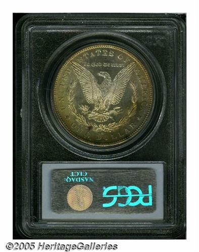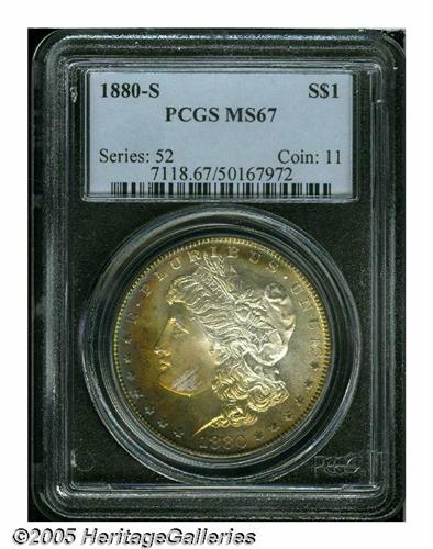 <B>1880-S<S$1> MS67 PCGS.</B></I> Medium S. The surfaces are very smooth and frosted with particularly bright, semi-prooflike fields. About half of the obverse is covered with golden, rose, and blue toning, while the reverse periphery is lightly accented with golden and blue patina. Fully struck and amazingly preserved.