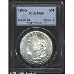 1880-S S$1 MS67 PCGS. The periphery has wispy tan-gold patina. A well struck Superb Gem with pleasing semi-prooflike luster and an immaculately preserved obverse. Struck from a lightly rusted obverse die. Important notice: We expect to be auctioning lots at the rate of 200-250 per hour. Sometimes eBay Premier live bid software cannot keep up with that pace, so we strongly recommend that you place a realistic proxy bid now as insurance to avoid disappointment. Also please note that all Heritage/CAA lots purchased through eBay Premier carry a 20% Buyer's Premium. Please make sure you read the Terms and Conditions.
