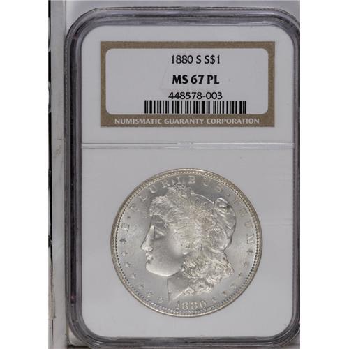<B>1880-S<img border='0' src='http://www.heritagecoins.com/images/star.gif' width=10 height=10>$1> MS67 Prooflike NGC.</B></I> A flashy coin with moderate mirrors and light mint frost on the devices. Almost every detail is sharply defined on each side.