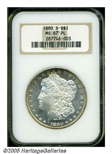 <B>1880-S<S$1> MS67 Prooflike NGC.</B></I> A razor-sharp and prominently mirrored Superb Gem, splendidly preserved and beautiful. Rose-red hues along the borders contribute further to the eye appeal. The medium S mintmark is repunched within the upper loop. In an older generation holder.