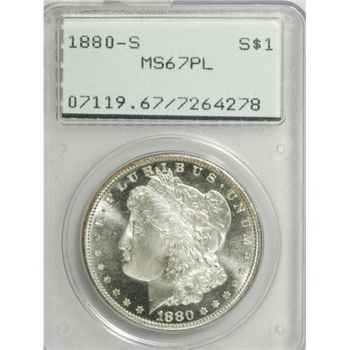 1880-S S$1 MS67 Prooflike PCGS. Medium S. Potent luste