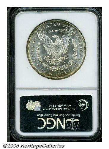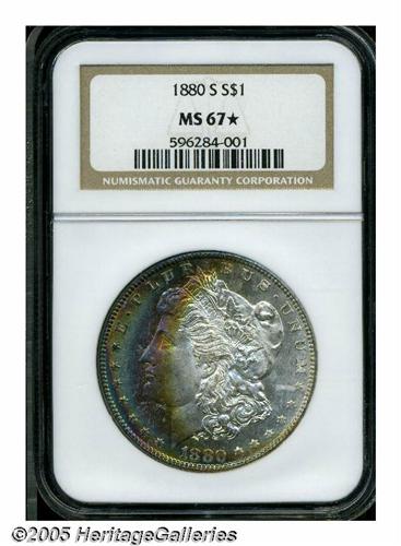 <B>1880-S<S$1> MS67 <S NGC.</B></I> Large S. Bands of vivid ruby-red, gold, and blue-green color alternate across the left obverse. The lower reverse border displays bright peach toning. A needle-sharp and well preserved Superb Gem.
