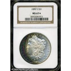 1880-S S$1 MS67 S NGC. Large S mintmark. Bands of <B>1880-S S$1 MS67 S NGC.</B></I> Large S mintmark. Bands of ruby-red, jade-green, and golden color enlighten the left obverse, while the remainder of the well preserved surfaces are essentially brilliant. A lustrous and exquisitely struck Superb Gem. <BR><BR><B>Important notice:</B> Heritage usually auctions material at the rate of 200-250 lots per hour. On some occasions eBay Live bid software or the Internet may not be able to keep up with the pace of the auction. We recommend placing a realistic absentee bid now as insurance to avoid disappointment. Occasionally the auctioneer may eliminate or reject an eBay Live bid, and the auctioneer may also reopen a lot after the close of the eBay live bidding (usually because we missed an audience bid), and may reject your bid even if it shows you as the winning bidder. By bidding via eBay Live, you agree that Heritage may award the lot to another bidder at its sole discretion under the circumstances described above or any other reasonable circumstances. Since eBay bids are not shown to us until we open the lot on the floor, we treat those bids just like floor bids. In most cases the floor responds before the eBay bid is presented to us, due to Internet lag time, so for consistency we have made it a policy that floor bids are always considered first over tie eBay live bids. Also please note that all Heritage lots purchased through eBay Live carry a 20% Buyer's Premium. Please make sure you read the Terms and Conditions before you bid. This lot is being auctioned in conjunction with a live floor auction by Heritage Galleries & Auctioneers. All final auction and invoice information will be supplied by Heritage Galleries & Auctioneers, and all other information should be considered preliminary. Lot:7363