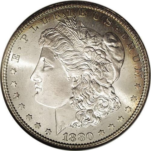 <B>1880-S<img border='0' src='http://www.heritagecoins.com/images/star.gif' width=10 height=10>$1> MS67 <img border='0' src='http://www.heritagecoins.com/images/star.gif' width=10 height=10> NGC.</B></I> Medium S. Smooth, highly lustrous surfaces display whispers of pastel cobalt-blue, lavender, and golden-tan patina around the upper and right (facing) obverse borders. The reverse is covered by slightly deeper hues of the same color pattern, but is joined by occasional accents of crimson. The design elements are sharply struck, revealing just slight softness in the hair over Liberty's ear. This splendidly preserved Superb Gem is highly recommended to the toning enthusiast.