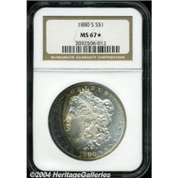 <B>1880-S<S$1> MS67 <S NGC.</B></I> Large S mintmark. Bands of ruby-red, sea-green, and gold color enlighten the left obverse, while the remainder of the well preserved fields possess light honey color. A lustrous and exquisitely struck Superb Gem. <BR><BR><B>Important notice:</B> Heritage usually auctions material at the rate of 200-250 lots per hour. On some occasions eBay Live bid software or the Internet may not be able to keep up with the pace of the auction. We recommend placing a realistic absentee bid now as insurance to avoid disappointment. Occasionally the auctioneer may eliminate or reject an eBay Live bid, and the auctioneer may also reopen a lot after the close of the eBay live bidding (usually because we missed an audience bid), and may reject your bid even if it shows you as the winning bidder. By bidding via eBay Live, you agree that Heritage may award the lot to another bidder at its sole discretion under the circumstances described above or any other reasonable circumstances. Since eBay bids are not shown to us until we open the lot on the floor, we treat those bids just like floor bids. In most cases the floor responds before the eBay bid is presented to us, due to Internet lag time, so for consistency we have made it a policy that floor bids are always considered first over tie eBay live bids. Also please note that all Heritage lots purchased through eBay Live carry a 20% Buyer's Premium. Please make sure you read the Terms and Conditions before you bid.