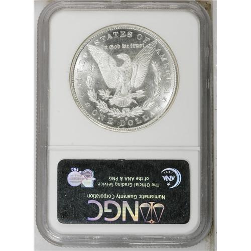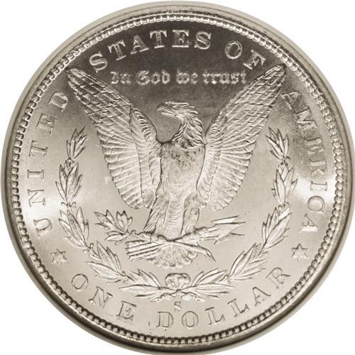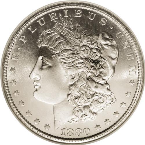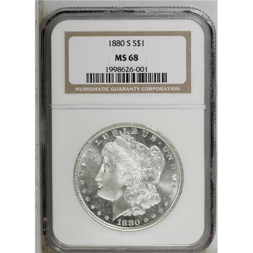 <B>1880-S<img border='0' src='http://www.heritagecoins.com/images/star.gif' width=10 height=10>$1> MS68 NGC.</B></I> Large S. This brilliant high grade Morgan dollar is crisply struck and beautifully preserved. The obverse is semi-prooflike, and exhibits a hint of contrast between the frosty portrait and the remarkably smooth field. The reverse displays vibrant cartwheel sheen. NGC has certified a mere three pieces in finer grades, as of (9/06).