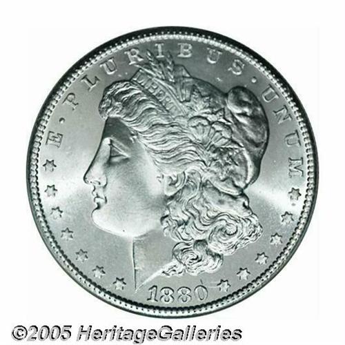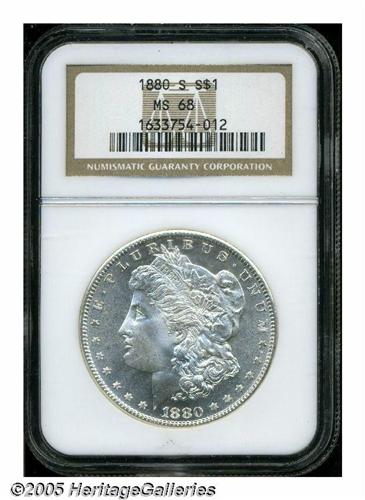 <B>1880-S<S$1> MS68 NGC.</B></I> This effulgent type candidate is pristine in all regards. Bothersome abrasions are nonexistent, nor can we find any other blemishes of note. Untoned, or essentially so, and possessed of modest brightness in the fields. Population: 133 in 68, 3 finer (4/05).