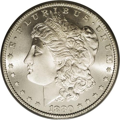 <B>1880-S<img border='0' src='http://www.heritagecoins.com/images/star.gif' width=10 height=10>$1> MS68 PCGS.</B></I> An absolutely Superb, untoned Gem example of an '80-S, with shimmering cartwheel luster and a bare minimum of surface marks on the finely detailed, creamy-white devices. Type collectors should pay close attention to this lot.