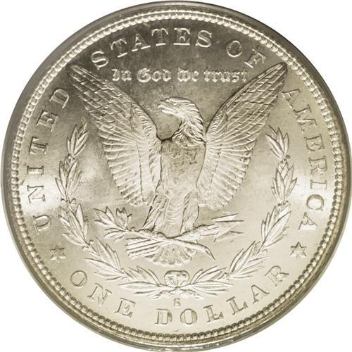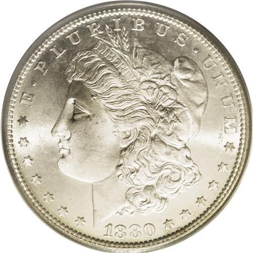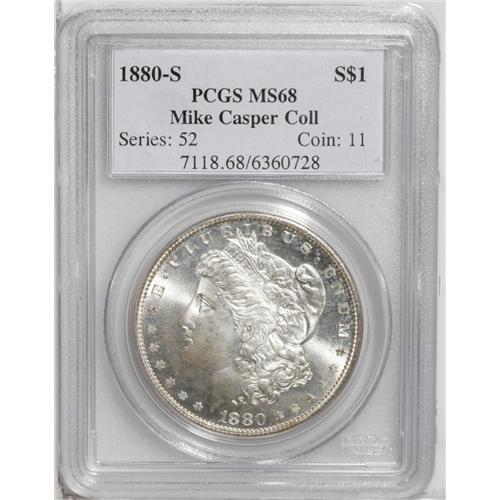 <B>1880-S<img border='0' src='http://www.heritagecoins.com/images/star.gif' width=10 height=10>$1> MS68 PCGS.</B></I> Ex: Mike Casper Collection. Medium S. An exemplary Superb Gem that has shimmering cartwheel luster and a bare minimum of nearly microscopic surface marks across the finely detailed and delicately patinated devices. The semi-reflective fields are essentially devoid of noticeable blemishes. An outstanding representative of this common S-mint issue. Population: 132 in 68, 5 finer (7/06).