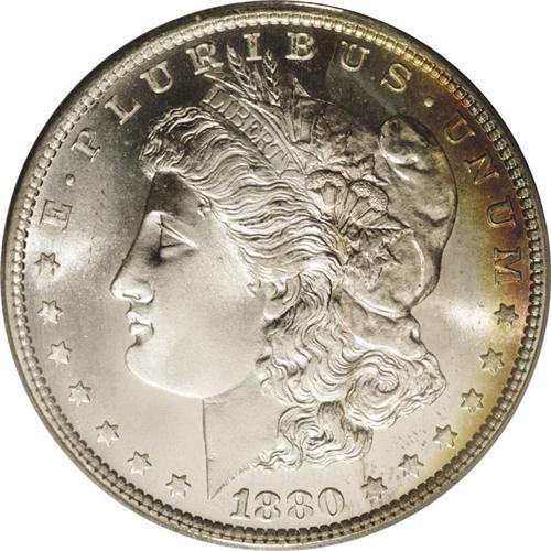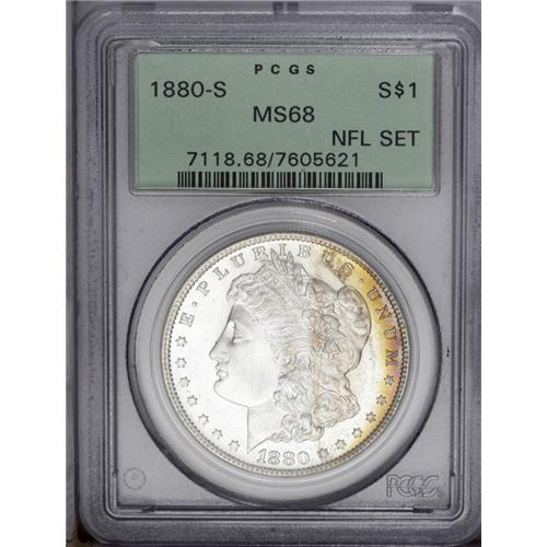 <B>1880-S<img border='0' src='http://www.heritagecoins.com/images/star.gif' width=10 height=10>$1> MS68 PCGS.</B></I> Ex: NFL Set. Medium S. Lovely, slender bands of lemon and plum adorn the right borders. The left portion of this lustrous Superb Gem is brilliant. Well struck, as is customary for the issue, and beautifully preserved. Encapsulated in a green label holder. NGC and PCGS have certified a mere nine pieces finer.<BR><I>Ex: Gregg Bingham NFL Collection, (Heritage, 1/01), lot 7919.</B></I><BR><I>From The Michael Casper Collection, Part Three.</B></I>