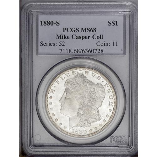 <B>1880-S<img border='0' src='http://www.heritagecoins.com/images/star.gif' width=10 height=10>$1> MS68 PCGS.</B></I> Ex: Mike Casper Collection. Medium S. An exemplary Superb Gem that has shimmering cartwheel luster and a bare minimum of nearly microscopic surface marks across the finely detailed and delicately patinated devices. The semi-reflective fields are essentially devoid of noticeable blemishes. An outstanding representative of this common S-mint delivery. PCGS has certified a mere five pieces finer, as of (1/06).<BR><I>From The Michael Casper Collection, Part Three.</B></I>