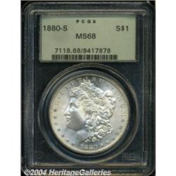 <B>1880-S<S$1> MS68 PCGS.</B></I> An impeccable, liberally frosted example that is completely untoned and snow-white over both the obverse and reverse. Surface marks are virtually non-existent. Sensational quality for this otherwise available, always popular issue.<BR><I>From the JFS Collection.</B></I> <BR><BR><B>Important notice:</B> Heritage usually auctions material at the rate of 200-250 lots per hour. On some occasions eBay Live bid software or the Internet may not be able to keep up with the pace of the auction. We recommend placing a realistic absentee bid now as insurance to avoid disappointment. Occasionally the auctioneer may eliminate or reject an eBay Live bid, and the auctioneer may also reopen a lot after the close of the eBay live bidding (usually because we missed an audience bid), and may reject your bid even if it shows you as the winning bidder. By bidding via eBay Live, you agree that Heritage may award the lot to another bidder at its sole discretion under the circumstances described above or any other reasonable circumstances. Since eBay bids are not shown to us until we open the lot on the floor, we treat those bids just like floor bids. In most cases the floor responds before the eBay bid is presented to us, due to Internet lag time, so for consistency we have made it a policy that floor bids are always considered first over tie eBay live bids. Also please note that all Heritage lots purchased through eBay Live carry a 20% Buyer's Premium. Please make sure you read the Terms and Conditions before you bid. </span></font></tr></table></td></tr></table>