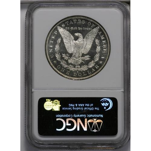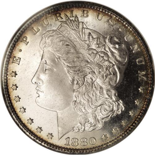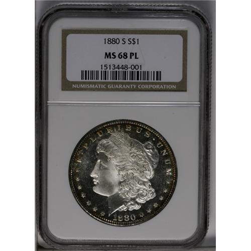 <B>1880-S<img border='0' src='http://www.heritagecoins.com/images/star.gif' width=10 height=10>$1> MS68 Prooflike NGC.</B></I> <I>If only all Morgan dollars looked like this!</B></I> Actually, that would create a host of interesting dilemmas, although it might lead to some fun speculation. But it is true that, to many collectors, 1880-S dollars, along with the 1881-S coins and an occasional 1882-S, represent the ultimate expression of the coiner's art in this series and approach the pinnacle of perfection. This piece has flashing silver-white, profoundly mirrored surfaces on both sides that combine with deep frost on the snowy devices. There is an accent of auburn-gold at the rim on each side. Another joy of this coin is that it is extremely well struck and, consistent with the grade, there are no distracting signs of contact. Census: 8 in 68 Prooflike, 0 finer (6/06).