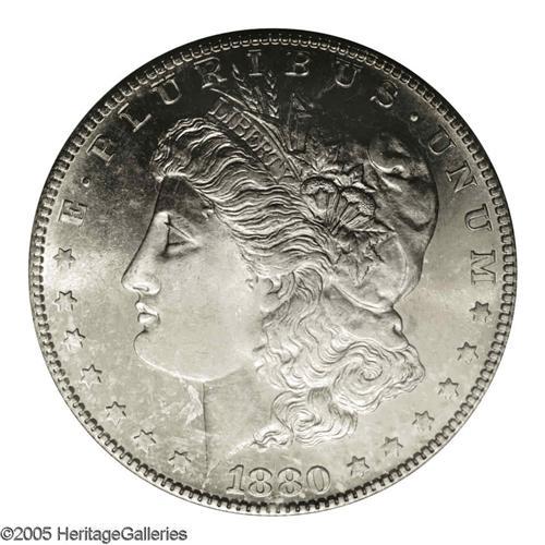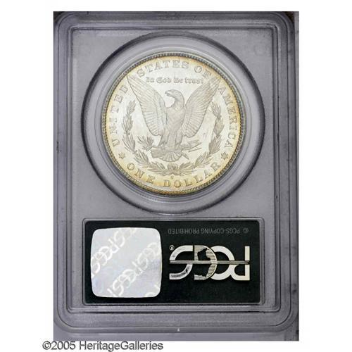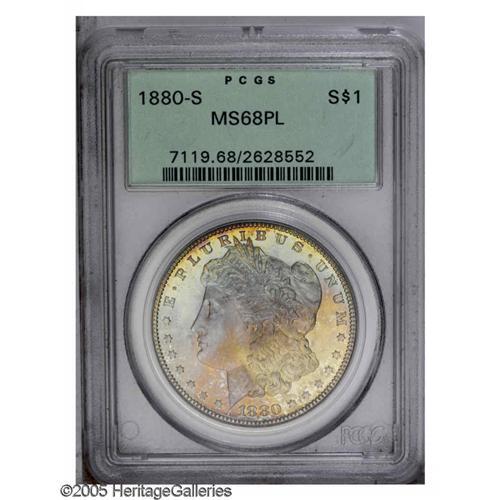 <B>1880-S<S$1> MS68 Prooflike PCGS.</B></I> This is a fabulous Superb Gem that displays gorgeous light aqua, gold and russet toning over the entire obverse. The reverse also has some gold toning, but it is much lighter in intensity. The strike is very sharp on the eagle's breast and hair over Liberty's ear. Close examination reveals a trivial nick on Liberty's cheek behind her nose, and on the reverse we note a pin point nick in the open field above the arrowheads. The combined NGC and PCGS population reports tally a total of 26 coins graded this high with a single piece seen finer of this date. This piece should sell to someone who appreciates the colorful array which is sometimes found on Morgan dollars.<BR><I>From The Michael Casper Collection, Part Two.</B></I>