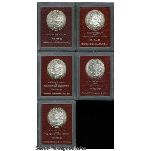 <B>1880-S<S$1> Morgan Dollar MS65 Paramount International (MS62),</B></I> Ex: Redfield, luminous honey and aqua margins; <B>1880-S Morgan Dollar MS65 Paramount International (MS63),</B></I> Ex: Redfield, lightly toned and highly lustrous; <B>1880-S Morgan Dollar MS65 Paramount International (MS63),</B></I> Ex: Redfield, attractive and only faintly toned; <B>1880-S Morgan Dollar MS65 Paramount International (MS64),</B></I> Ex: Redfield, freckles of golden-brown toning along the obverse periphery; <B>1881-S Morgan Dollar MS65 Paramount International (MS64),</B></I> beautiful golden-brown and sea-green colors cling to the borders.