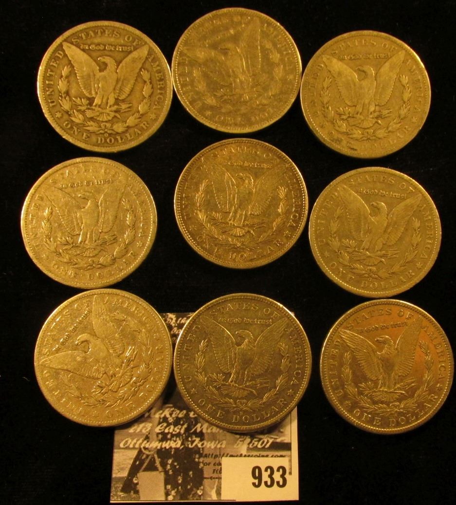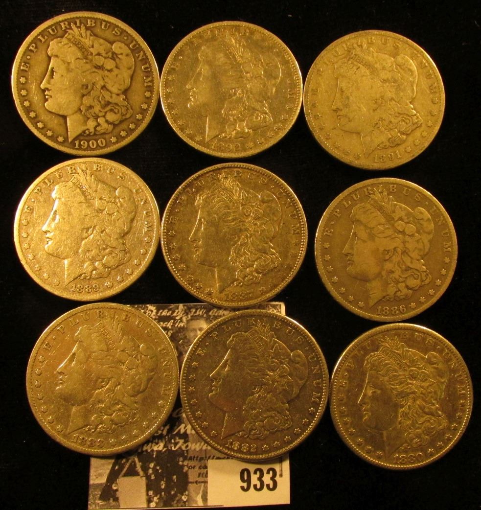 1880 S VF+, 82 S VF, 83 P VG, 86 O VG, 87 P Fine, 89 P VG, 91 O VG, 92 O Fine, & 1900 O VG U.S. Silver Morgan Dollars.