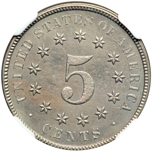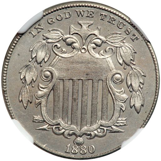 1880 Shield Nickel. NGC graded Proof 63. Lightly toned.