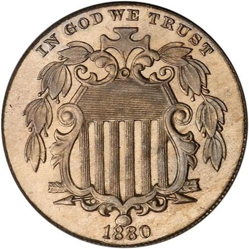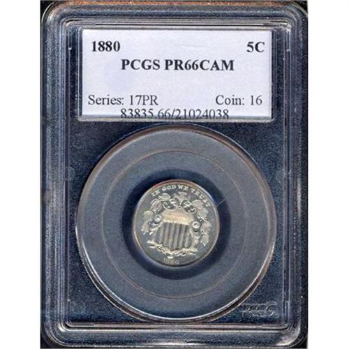 <b>1880 Shield Nickel. PCGS graded PF66 CAM.</b> An intensely beautiful shield nickel, a coin with superb surfaces and a strike that is amazingly bold including all devices having cameo frost. Intense mirror reflection suggests that the present specimen spent much of its life in a highly guarded condition away from sulfur paper, and out of the hands of coin-dipping fiends in the 1960s and 1970s! Bidders will want to plant themselves firmly in their chairs (whether in the auction room itself or before their computer monitors) when the sale of this piece commences (Proof mintage was only 3,955 pieces.) <b>(PCGS # 83835)</b>
