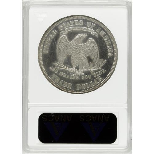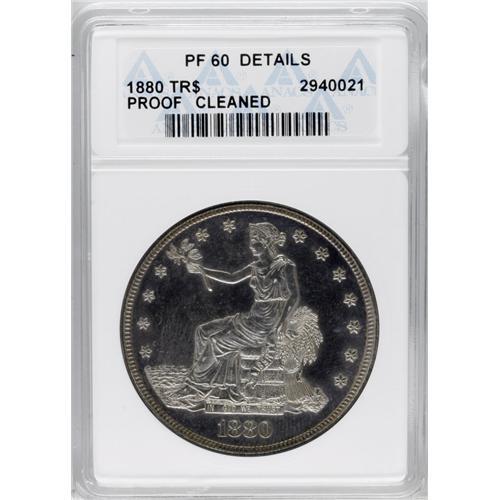 <B>1880 T$1 --Cleaned--ANACS. PR60 Details.</B></I> This exactingly struck specimen's naturally reflective luster has received some undesirable "assistance" in the past. Light golden-blue patina does not obscure the hairlines present in the fields.<BR><BR><b>Shipping:</b> Coins & Currency (<a target="_blank" href="http://www.heritageauctions.com/common/shipping.php">view shipping information</a>)