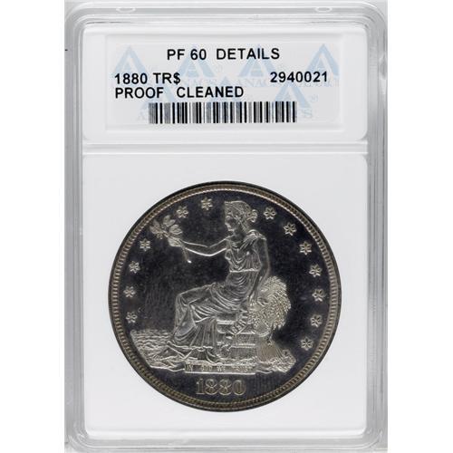 <B>1880 T$1 --Cleaned--ANACS. PR60 Details.</B></I> This exactingly struck specimen's naturally reflective luster has received some ill-advised cleaning in the past. Light golden-blue patina does not obscure the hairlines present in the fields.<BR><BR><b>Shipping:</b> Coins & Currency (<a target="_blank" href="http://www.heritageauctions.com/common/shipping.php">view shipping information</a>)