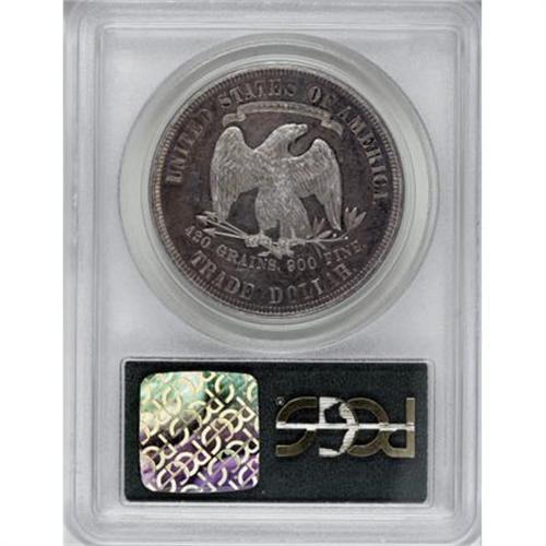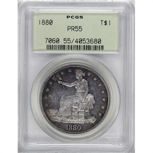 <B>1880 T$1 PR55 PCGS.</B></I> Splashes of rose and sea-green embrace this lightly circulated proof-only Trade dollar. The fields retain ample flash, and also display distributed tiny marks. Encapsulated in an old green label holder.<BR><I>From The Yoder Family Collection, Part One.</B></I><BR><BR><B>Coin Engraver:</B> William Barber<BR><BR><b>Shipping:</b> Coins & Currency (<a target="_blank" href="http://www.heritageauctions.com/common/shipping.php">view shipping information</a>)
