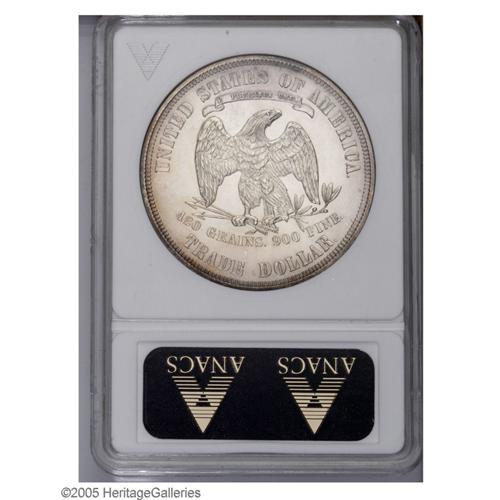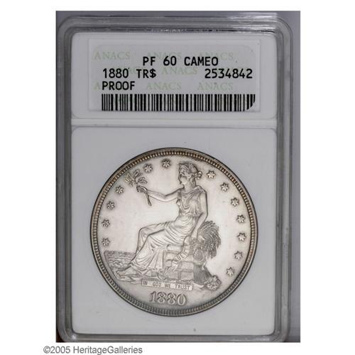<B>1880<T$1> PR60 Cameo ANACS.</B></I> Noteworthy Cameo contrast exists on this deeply toned, abrasion-free proof Trade dollar. Numerous hairlines in the fields account for the PR60 grade designation.