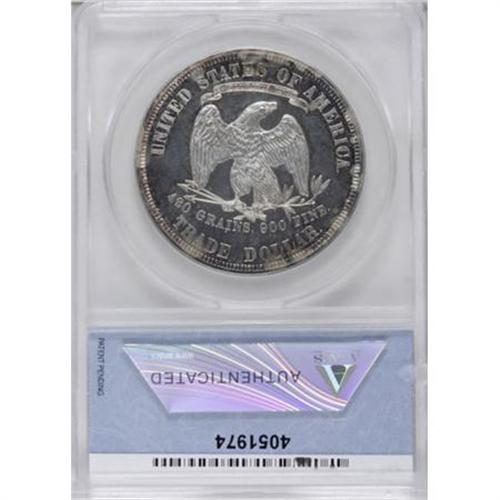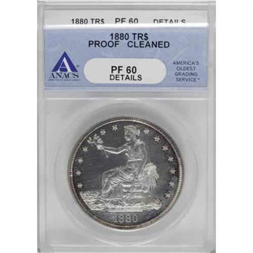 <B>1880 T$1 --Cleaned--ANACS. PR60 Details.</B></I> Golden-brown and electric-blue embrace the peripheries of this hairlined and razor-sharp proof-only specimen. The devices demonstrate cameo contrast with the glassy fields, although undesignated as such by ANACS.<BR><I>From The John Stimson, Sr. Collection, Part Two.</B></I><BR><BR><B>Coin Engraver:</B> William Barber<BR><BR><b>Shipping:</b> Coins & Currency (<a target="_blank" href="http://www.heritageauctions.com/common/shipping.php">view shipping information</a>)