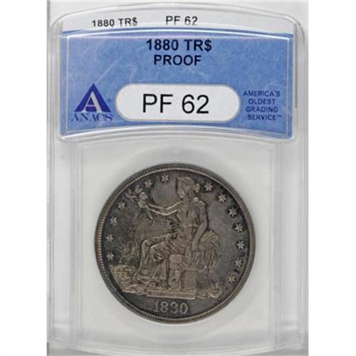 <B>1880 T$1 PR62 ANACS.</B></I> Deep brown-gray and forest-green toning blankets the obverse. The reverse displays milky sky-blue, cream-gray, and rose coloration. Boldly struck and contact-free with a few wispy hairlines and a partial thumbprint on the obverse.<BR><BR><B>Coin Engraver:</B> William Barber<BR><BR><b>Shipping:</b> Coins & Currency (<a target="_blank" href="http://www.heritageauctions.com/common/shipping.php">view shipping information</a>)
