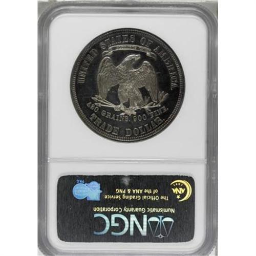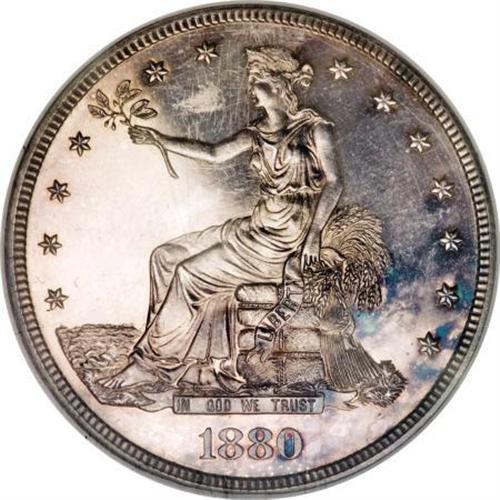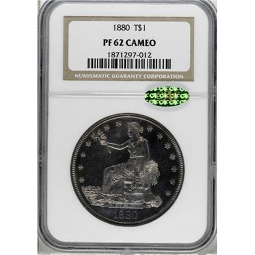 <B>1880 T$1 PR62 Cameo NGC. CAC.</B></I> This upper-end coin shows deeply reflective proof fields with light, mottled violet and blue toning on the obverse and pale golden over the reverse. The devices are noticeably frosted, which gives the piece a strong cameo effect on each side. Light hairlines and a few minor contact marks account for the grade. <BR><I>From The Queller Family Collection of Silver Dollars.</B></I><BR><BR><b>Shipping:</b> Coins & Currency (<a target="_blank" href="http://www.heritageauctions.com/common/shipping.php">view shipping information</a>)