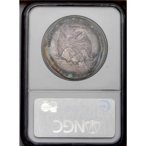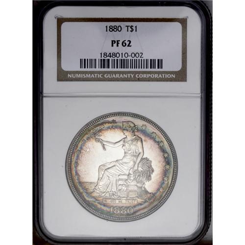 <B>1880<T$1> PR62 NGC.</B></I> Dramatically deep iridescent coloration has settled over each side of this crisply struck proof specimen. Only the figure of Liberty remains essentially untoned. The right side obverse stars are flat, and some wispy hairlines are noted in the fields, but the coin is free of contact marks.